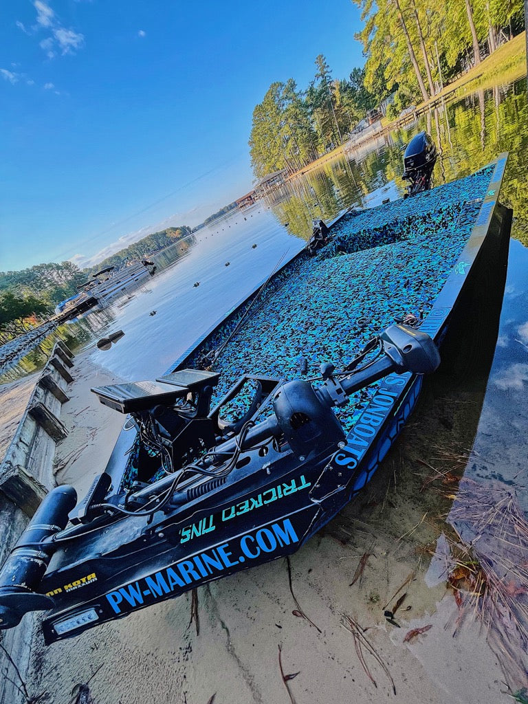 Large sheet of Hydro-Turf boating mats. Available in solid, camo and 2-tone colors. All boating sheets come with self-adhesive. This provides a strong, fast, and clean application to fiberglass and aluminum surfaces. All sheets have a useable area of 43" x 83" except for the woodgrain sheets, which have a useable area of 41" x 83"